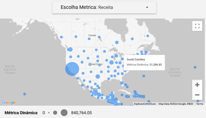 Gráfico de Mapas: Gráfico de mapas que permite visualizar a dimensão dos indicadores selecionados, como "Novos usuários", "Receita total", "Transações" e "Usuários totais", por região. A variação de tamanho dos círculos no mapa reflete os valores relativos de cada parâmetro, facilitando a análise geográfica do dado escolhido.