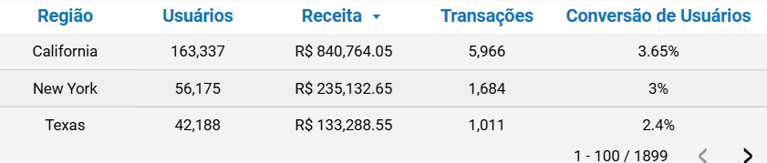 - Fonte de dados: Tabela: “ga4_sumario”; Colunas: “region”, "totalrevenue", "totalusers", "newusers", "transactions".