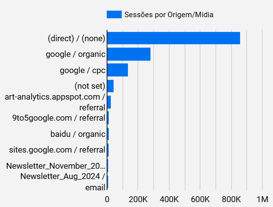 Gráfico Sessões por Origem/Mídia da Sessão: Entenda quais fontes de tráfego impulsionam mais visitas, visualizando a quantidade de sessões e otimize suas estratégias de aquisição.