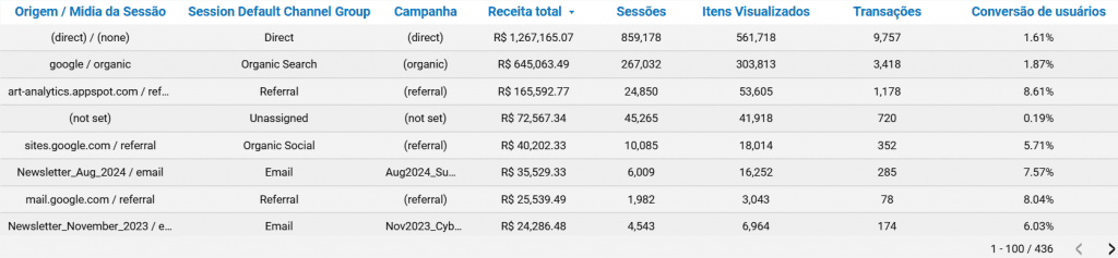 Fonte de dados: Tabela “ga4_page”; Colunas: “sessiondefaultchannelgroup”,"sessiondefaultchannelgroup","sessioncampaignname","totalrevenue", "sessions", "itemviewevents", "transactions", "totalusers".