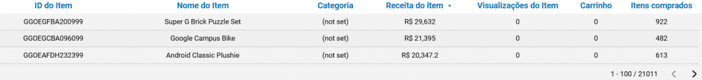 - Fonte de dados: Tabela : “ga4_produtos”; Campos: “itemid”, "itemname", "itemcategory", "itemrevenue", "itemsviewed", "itemsaddedtocart", "Itemspurchased".
