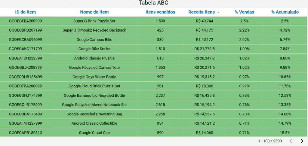 Tabela Curva ABC: Tabela que apresenta as informações de curva ABC, ou seja, quanto representa percentualmente o faturamento em vendas de cada item. Além disso, é informada a respectiva receita. Todas as informações variam de acordo com os filtros selecionados.
