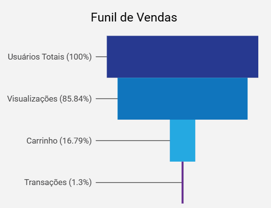 Gráfico Funil de Vendas: Entenda a conversão dos seus usuários com o Gráfico de Funil de Vendas. Veja cada etapa da jornada: Total de Usuários, Itens Visualizados, Itens Adicionados ao Carrinho e Transações, com números absolutos e percentuais do total.