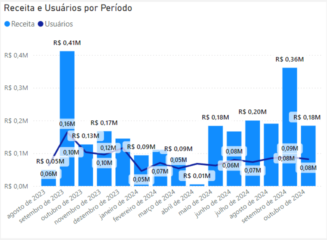 Gráfico Receita e Usuários por Período: Gráfico de visualização em eixo duplo, que permite analisar a relação entre receita e volume de usuários em cada período.