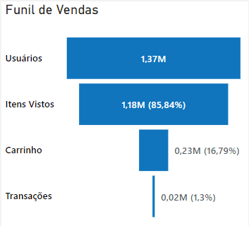 Gráfico Funil de Vendas: Entenda a conversão dos seus usuários com o Gráfico de Funil de Vendas. Veja cada etapa da jornada: Total de Usuários, Itens Visualizados, Itens Adicionados ao Carrinho e Transações, com números absolutos e percentuais do total.