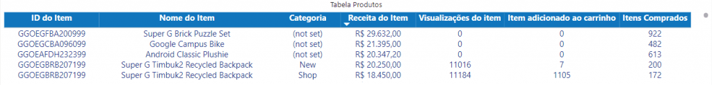 - Fonte de dados: Tabela : “ga4_produtos”; Campos: “itemid”, “itemname“, “itemcategory“, “itemrevenue“, “itemsviewed“, “itemsaddedtocart“, “Itemspurchased“.