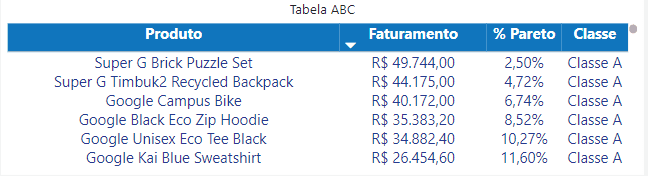 Tabela Curva ABC: Tabela que apresenta as informações de curva ABC, ou seja, quanto representa percentualmente o faturamento em vendas de cada item. Além disso, é informada a respectiva receita. Todas as informações variam de acordo com os filtros selecionados.