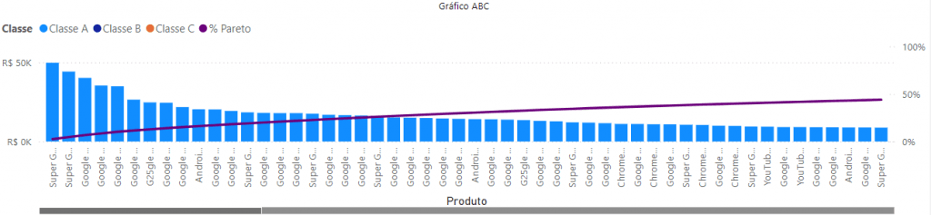 Gráfico Curva ABC: Gráfico que apresenta as informações de curva ABC por produto em forma de visualização gráfica de colunas e linhas. Todas as informações variam de acordo com os filtros selecionados.