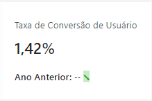 - OBS: Trata-se da divisão entre “transactions” e “totalusers” representada percentualmente. Além de apresentar a taxa de conversão de usuários no período, há um comparativo (percentual e quantitativo) com o mesmo período no ano anterior ao selecionado.
