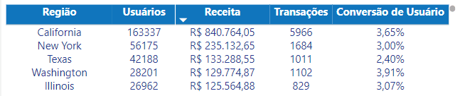 - Fonte de dados: Tabela: “ga4_sumario”; Colunas: “region”, “totalrevenue“, “totalusers“, “newusers“, “transactions“.