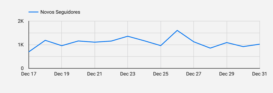 Gráfico Novos seguidores últimos 30 dias: Gráfico de linhas, que permite analisar a quantidade de novos seguidores do perfil diariamente, dos últimos 30 dias a partir da integração dos dados.