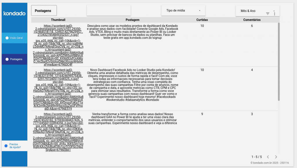 A página de Postagens do Dashboard Instagram, permite explorar métricas detalhadas das publicações, como curtidas e comentários.
