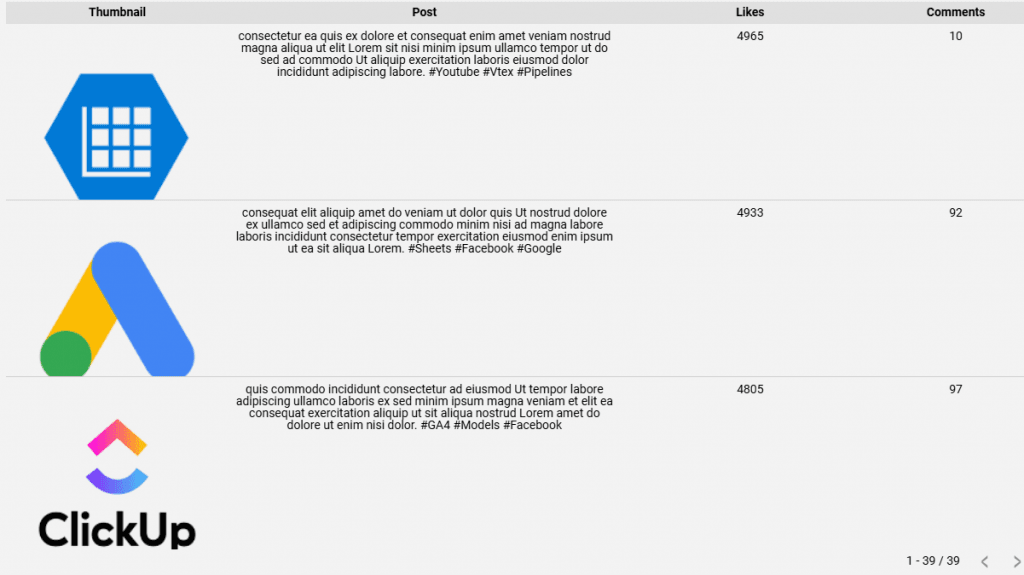 Ao utilizar nosso template de Dashboard para Looker Studio pela primeira vez, é possível que que na tabela de desempenho de postagens as imagens não estejam visíveis como no exemplo abaixo: