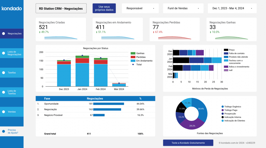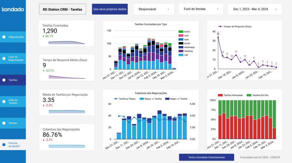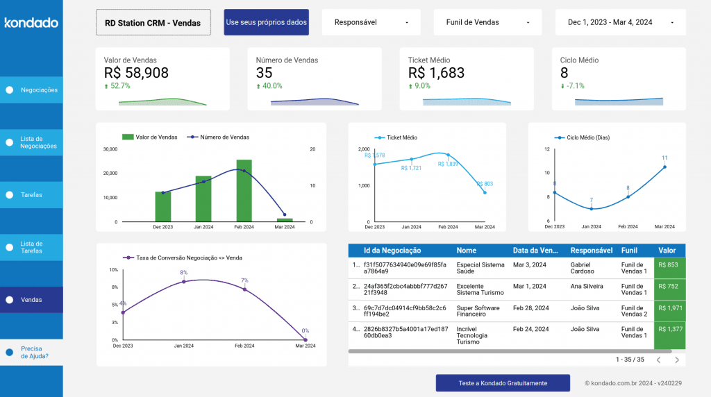 Este guia fornece um detalhamento sobre as funcionalidades do Dashboard RD Station CRM da Kondado. Caso precise de auxílio para integrar seus dados ao Dashboard, siga as etapas deste guia para configurar a integração com o RD Statio CRM e aproveitar todas as funcionalidades de um Dashboard personalizável.