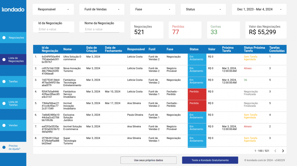 | Lista de Negociações | Tabela | – Id da Negociação: Identificação da negociação – Nome: Nome da negociação – Data de Criação: Data de criação da negociação – Data de Fechamento: Data de fechamento da negociação caso ela tenha sido ganha ou perdida – Responsável: Vendedor responsável pela negociação – Funil de Vendas: Funil ao qual pertence a negociação – Fase: Fase atual da negociação no funil de vendas – Status: Campo calculado indicado status atual da negociação no funil de vendas, podendo ser: Em Andamento (negociação ainda aberta no funil de vendas), Ganha ou Perdida – Valor: Valor das negociações que possuem tal informação cadastrada – Próxima Tarefa: Data da próxima tarefa agendada para a negociação – Status Próxima Tarefa: Campo calculado indicando o status da próxima tarefa, podendo ser: Ok (a data da próxima tarefa ainda está no futuro), Atraso (a data da próxima tarefa já passou e ela ainda não foi concluída), Sem Tarefa Agendada (a negociação ainda está em aberto e não há uma próxima tarefa agendada) e Negociação Finalizada (indica que a negociação está ganha ou perdida, portanto não há mais tarefas a serem feitas para ela) – Tarefas Concluídas: Número de tarefas concluídas atribuídas à negociação |