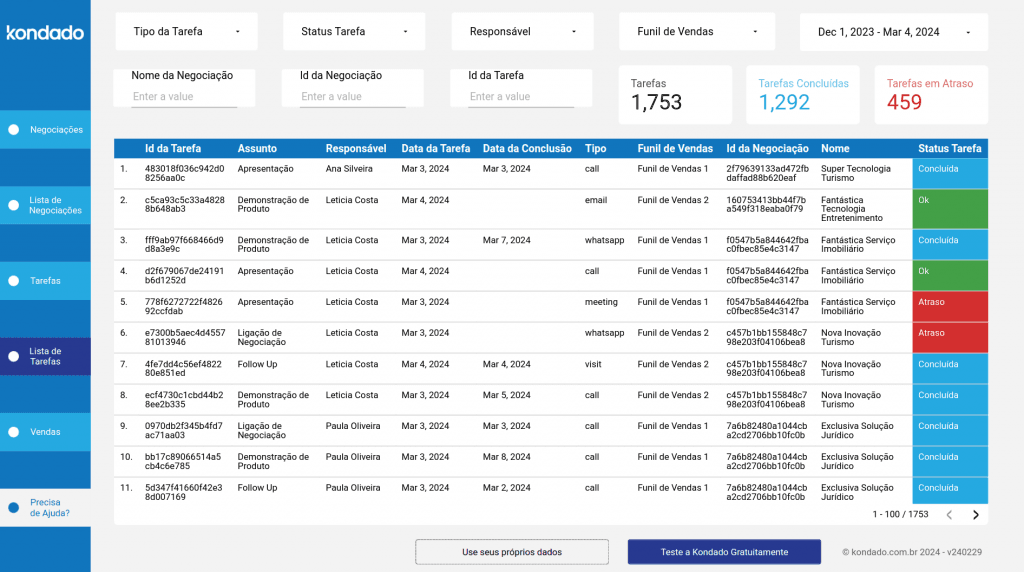 | Lista de Tarefas | Tabela | – Id da Tarefa: Identificação da tarefa – Assunto: Assunto da tarefa – Responsável: Vendedor responsável pela tarefa – Data da Tarefa: Data de agendamento da tarefa – Data da Conclusão: Data da conclusão da tarefa, caso tenha sido concluída – Tipo: Tipo da tarefa – Funil de Vendas: Funil ao qual pertence a negociação cuja tarefa está associada – Id da Negociação: Identificação da negociação cuja tarefa está associada – Nome: Nome da negociação cuja tarefa está associada – Status Tarefa: Campo calculado indicando o status da tarefa, entre Concluída, Atraso (em aberto, cuja data está no passado), Ok (em aberto, cuja data está para o futuro) |