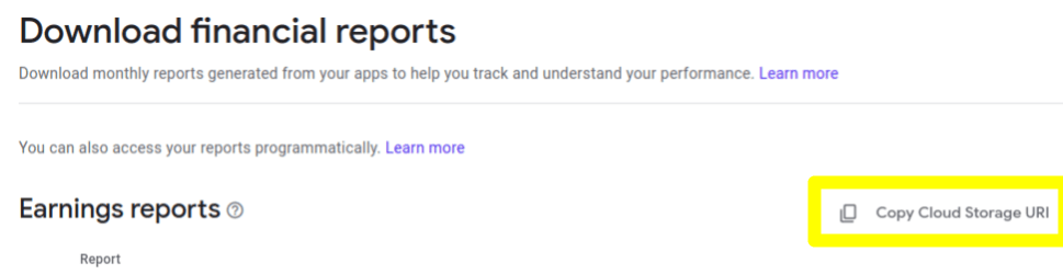 3) Na página de download de relatórios, clique no botão "Copy Cloud Storage URI" e cole o valor em um bloco de anotações