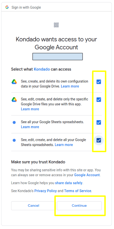 3. Na página de autorização, selecione TODAS as permissões requisitadas e depois clique em "Continuar" (Continue)