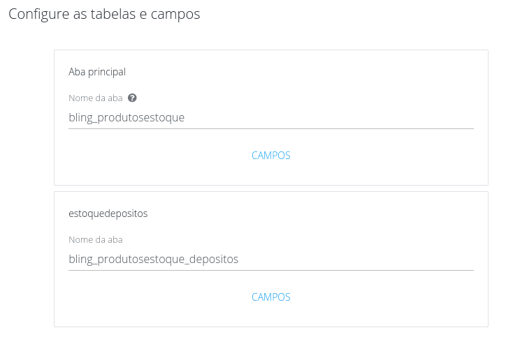 - Descrição: JSON com os paths de tabelas como chaves e novos nomes destas tabelas como valores. Os paths referentes a cada tabela podem ser obtidos ao realizar uma edição avançada na integração, no momento de dar nome às tabelas (ver imagem abaixo). A tabela principal deve ser informado como path string vazia (""). Todos os paths constantes na integração devem ser informados. A integração criada não ira fazer nenhuma verificação ou exibir aviso no caso de tabelas como os nomes informados já existirem no destino, estas serão apenas recriadas com a nova configuração
