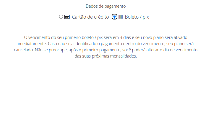 - Após a confirmação do método de pagamento em cartão, serão feitas uma validação do próprio cartão e uma confirmação da transação. Em caso de algum problema, você será notificado(a). O seu plano será efetivado assim que a transação for concluída com sucesso.
