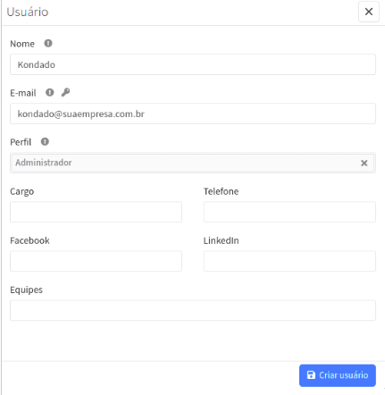 4) Preencha nome o “Kondado”, email “kondado@suaempresa.com.br” (utilize um email válido da sua empresa) e perfil Administrador > Criar usuário
