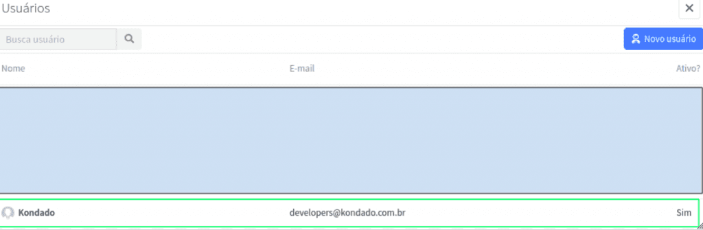 6) Voltando ao modal de listagem de usuários, selecione o usuário Kondado recém criado
