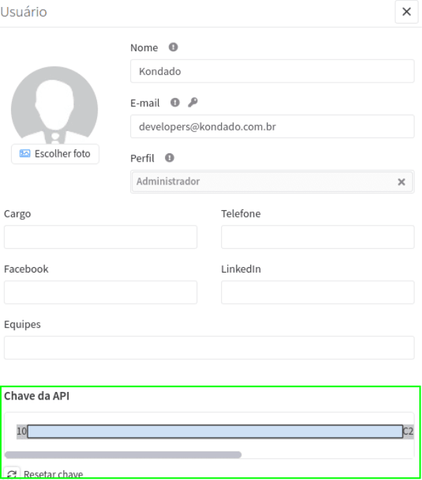 8) Faça login na plataforma da Kondado, clique para criar um novo conector Ploomes e cole em "Chave da API" o valor obtido no passo 7