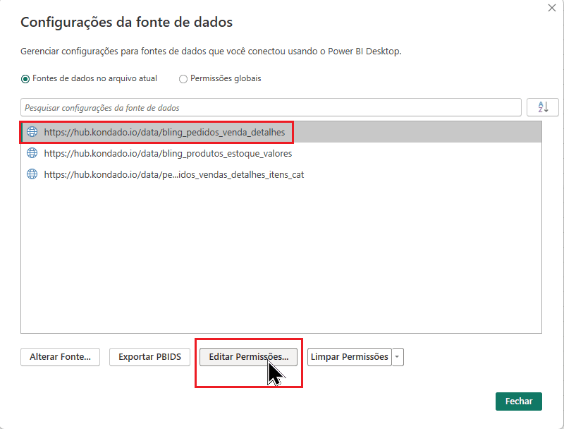 - Na janela que aparecer, selecione cada fonte de dados individualmente e clique em Editar Permissões.