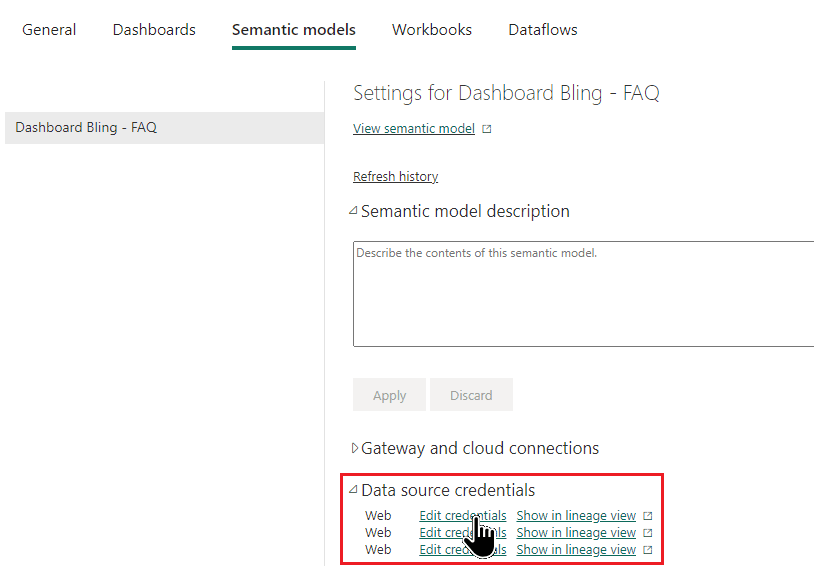 - Na página que será exibida, localize a seção Data source credentials e clique em Edit credentials para cada fonte de dados.