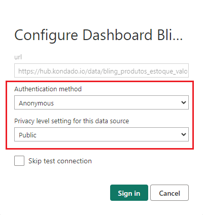 - Em "Privacy level settings for this data source", escolha a opção Public e clique em Sign in.