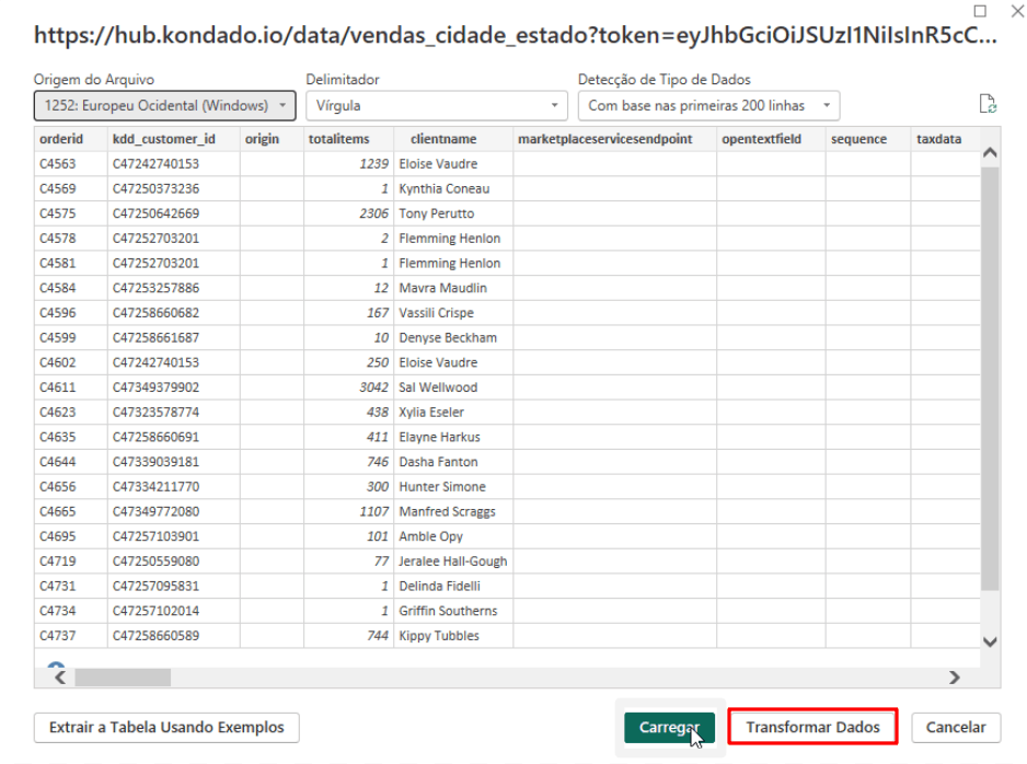 5. Após inserir a URL, o Power BI mostrará uma parte da tabela para que você se certifique de que os tipos dos dados estão corretos. Caso seja, clique na opção Transformar Dados. Em seguida, o Power BI carregará seus dados: