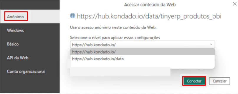 3. Na seleção da fonte de dados, escolha a opção Web e clique em Conectar