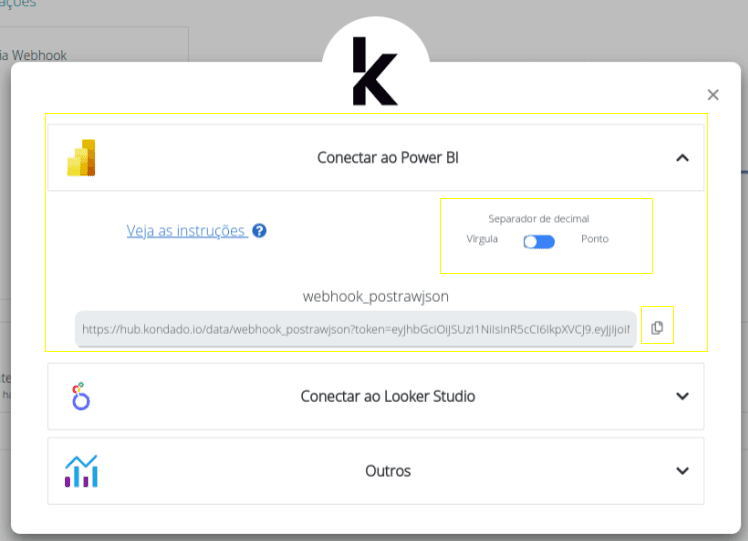 - Na janela seguinte, clique em "Conectar ao Power BI" e então selecione a opção do separador decimal (vírgula ou ponto). Em seguida, verifique qual tabela deseja adicionar ao Power BI e então clique no botão de copiar a URL ao lado: