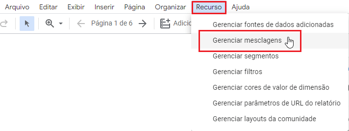 1 - Na barra de tarefas do Looker Studio, clique em “Recurso” e em seguida em “Gerenciar Mesclagem”;