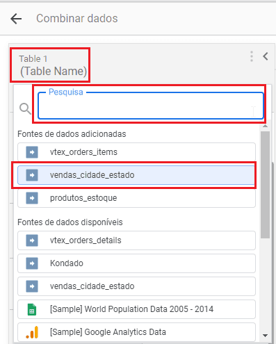 3 - Em “Table 1”, pesquise pela tabela que deseja utilizar, no caso em exemplo, utilizaremos a tabela “vendas_cidade_estado”;