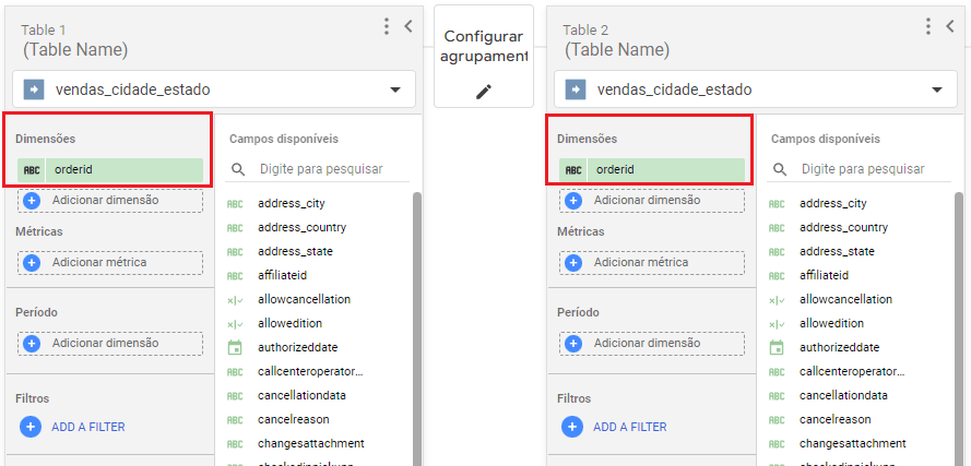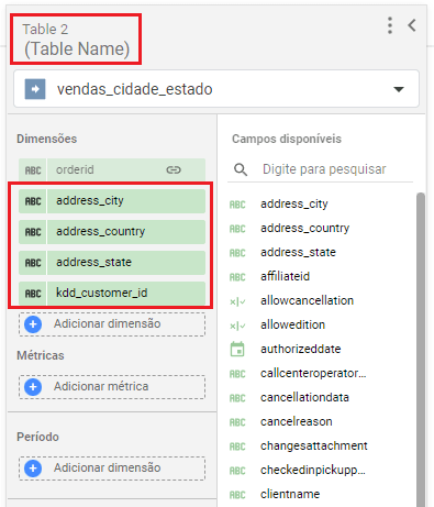 9 - Em seguida, na “Tabela 2”, adicione em “dimensões” os campos que deseja usar no dashboard. Deixe o campo de período em branco!