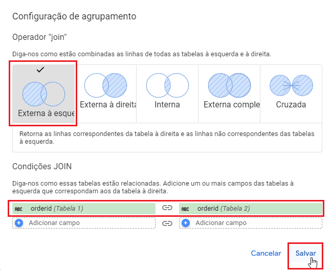 7 - Em “Operador Join” selecione a opção “Externa à esquerda”, em “Condições JOIN”, selecione a dimensão chave para as duas tabelas e clique em “Salvar”;