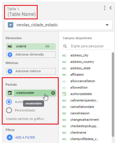 8 - Agora, apenas na “Tabela 1”, clique em “período” e selecione a opção de data desejada, neste caso usaremos a “creationdate”;