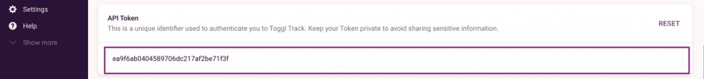 1) Faça login em sua conta Toggl acesse sua página de perfil em https://track.toggl.com/profile e copie o valor de API Token