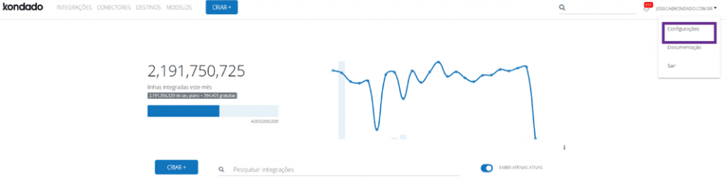 1) Uma vez logado, clique no seu e-mail (menu superior à direita) e depois em "Configurações":