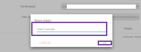 - Token: Essa informação é similar a uma senha e será exibida apenas no instante de sua criação. Guarde-a em um lugar seguro (ou já diretamente na aplicação que irá interagir com a Kondado):