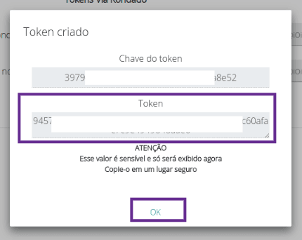 6) Após clicar em "OK", nossa plataforma irá gerar o seu token. Ele é composto por duas partes: