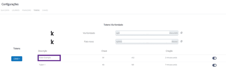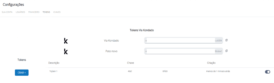 3) Você verá a página de tokens, onde poderá criá-los ou ativar e desativar os já existentes. Os tokens estão vinculados ao usuário que os criou. Nesta página, há 2 (dois) tipos de tokens: os relacionados ao destino Via Kondado ("Tokens Via Kondado") e os criados pelos usuários (abaixo de "Tokens", ao lado do botão "CRIAR +"):