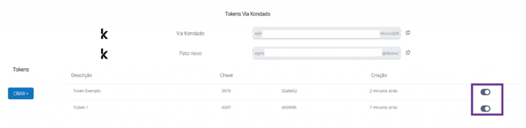 8) Quando já possuir tokens criados, você pode ativá-los ou desativá-los a qualquer momento clicando nos switches à direita. Desativar um token o tornará inacessível: