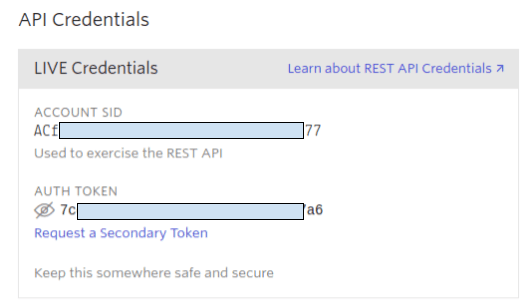 3) Procure pela seção "API Credentials" > "LIVE Credentials" e copie os valores "Account SID" e "Auth Token"