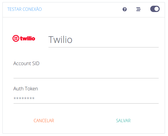 5) No conector, em "Nome" dê um nome para o seu conector e, em "Account SID" e "Auth Token" copie os valores obtidos no passo (3)
