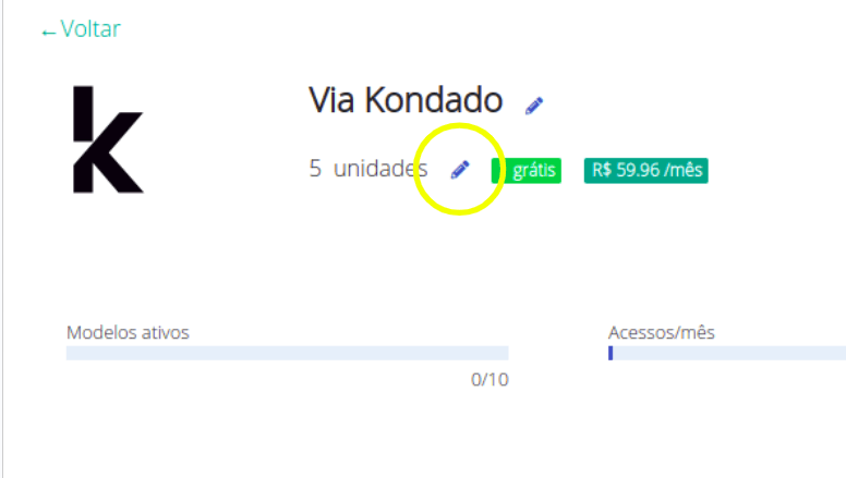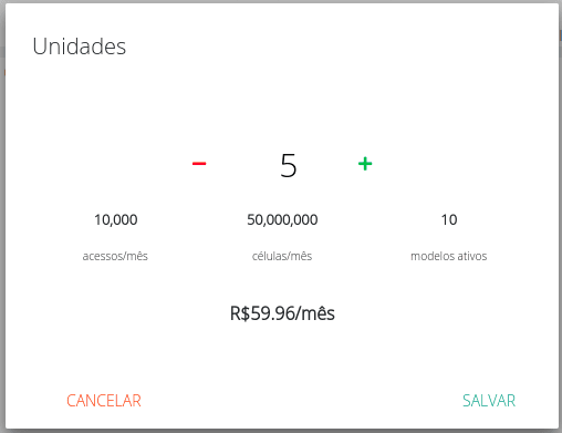 O modal que será aberto indicará a precificação mensal total. Podem ser concedidas unidades gratuitas, a nosso critério. Basta clicar em SALVAR para aplicar a nova configuração