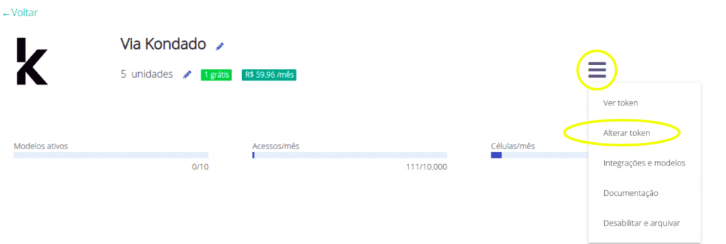 Para alterar o token de acesso de seu destino, basta acessá-lo, clicar nas 3 barras horizontais e então “Alterar token”