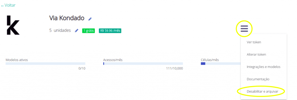 Você pode arquivar uma integração ou modelo para remover estes dados específicos de seu destino Via Kondado