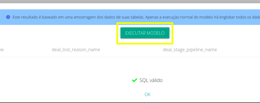 Caso durante o teste seja encontrado um erro, ele será apresentado. Caso não haja erros, o resultado da execução com a amostra de dados será apresentado e você poderá também executar seu modelo imediatamenete - clicar neste botão irá também salvar o SQL que está em seu editor